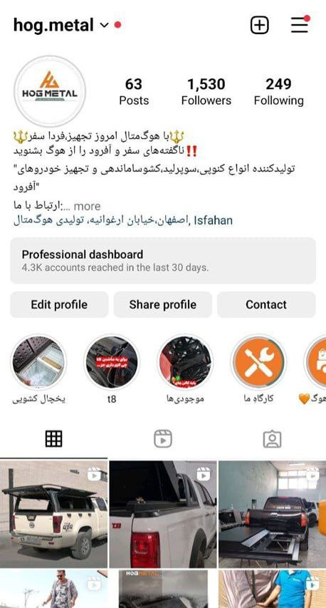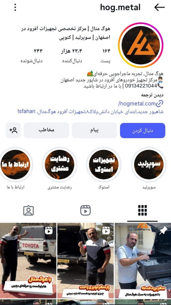 شرکت هوگ متال از سال ۱۳۹۸ در اصفهان فعالیت خود را در زمینه تولید و تجهیز خودروها و تجهیزات بیراههنوردی (آفرود) آغاز کرده است. این مجموعه با بهرهگیری از تیم مجرب و دستگاههای بهروز، محصولات با کیفیت و سفارشی برای انواع خودروهای آفرود و کمپینگ تولید میکند. هوگ متال با پشتوانه تجربه ۱۵ ساله در صنعت گردشگری و آفرود، ترکیبی از هنر، قدرت و کیفیت را برای طبیعتگردان و علاقهمندان ارائه میدهد.